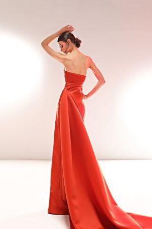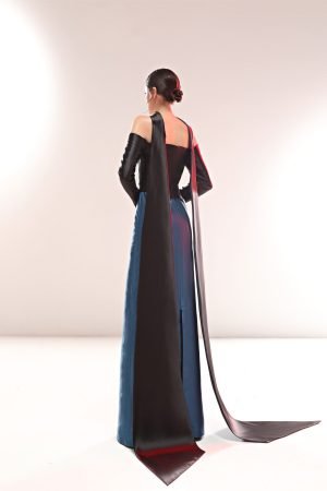 The dress features a side-flowing tail, adding a dynamic edge to its silhouette, while hand-embellished beads and feathers at the hem bring an extra layer of luxury and texture. An additional neck piece completes the look, making the Olivia dress a standout choice for any high-fashion event. With its bold design and meticulous craftsmanship, the Olivia dress ensures you’ll make an unforgettable statement wherever you go.