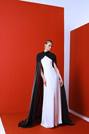 THEASYMMETRIC DRAPE,CRAFTED IN LUSTROUS SILKSATIN,CASCADES OVER THE SHOULDERAND DOWN THEBACK,ADDING A DRAMATICTOUCH OF REGALITYAND