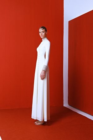 MOVEMENT TO THE ENSEMBLE. THE GOWN IS PUNCTUATEDWITH THREE ORNATECRYSTAL EMBELLISHMENTSAT THE FRONT,ACTING AS SUBTLE YET EYE-CATCHING