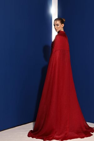 A VISION OF REFINED LUXURY, THE MOCHA OPULENCE GOWN IS CRAFTED FROM RICH, LUSTROUS FABRIC IN A WARM MOCHA HUE. THE STRUCTURED SILHOUETTE IS ACCENTUATED BY A HIGH COLLAR AND A ROW OF DELICATE FABRIC-COVERED BUTTONS RUNNING DOWN THE FRONT. SUBTLE CONTRAST EMERGES THROUGH THE FLARED CUFFS IN A COMPLEMENTARY TEXTURED FABRIC, ADDING DEPTH AND SOPHISTICATION. A PERFECT BLEND OF REGAL ELEGANCE AND CONTEMPORARY PRECISION.