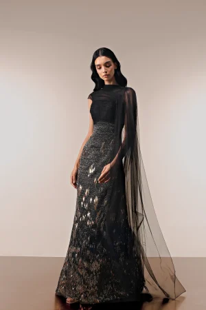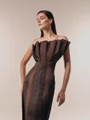 THIS SCULPTED EVENING GOWN IS DESIGNED TO ACCENTUATE THE FIGUREWITH ASLEEK, ELONGATED SILHOUETTE.CRAFTED IN ARICH CHOCOLATE-BROWN TONE, THE DRESS FEATURESASOFTLY STRUCTURED BODICEWITH SCULPTURAL PLEATING ALONG THE NECKLINE,CREATING AN ARCHITECTURAL YET FLUID FORM THAT FRAMES THE SHOULDERSBEAUTIFULLY. THE FITTEDWAIST FLOWS INTO ASTREAMLINED SKIRT, ENHANCED BY SUBTLE TEXTURAL DETAILING THATADDS DEPTH AND VISUAL INTERESTWHILE MAINTAINING A CLEAN, REFINED FINISH. THOUGHTFULLY TAILOREDWITH PRECISION, THIS GOWN BALANCES MODERN STRUCTUREWITH TIMELESS ELEGANCE, MAKING ITASTRIKING CHOICE FOR ELEVATED EVENING OCCASIONS.