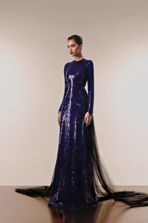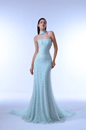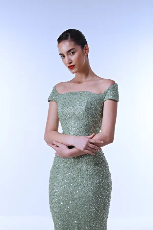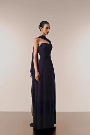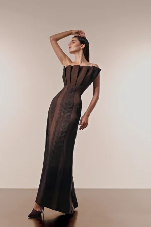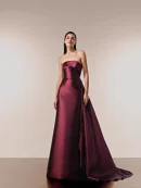OFF -SHOULDER EVENING GOWN ISCRAFTED IN ARICH PLUM MIKADO , DESIGNED TO FLOWEFFORTLESSLYWITH ASOFT, LUMINOUS FINISH. THE STRUCTURED BODICE FEATURES SUBTLECONTOURING THAT ENHANCES THEWAIST,WHILE THE SMOOTH STRAIGHT SKIRT FALLS GRACEFULLY TO THE FLOOR,CREATING AN ELONGATED AND ELEGANT SILHOUETTE. MINIMAL SEAMSAND ACLEAN NECKLINE HIGHLIGHT THE GOWN’S TIMELESS DESIGN,ALLOWING THE FABRIC’S NATURAL SHEEN TO TAKECENTER STAGE. FINISHED WITH EXPERT TAILORING AND FLUID MOVEMENT, THIS PIECE EMBODIES UNDERSTATED LUXURYAND MODERN SOPHISTICATION.